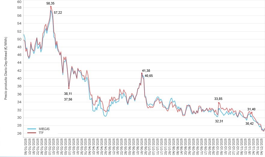 Durante 2025 los precios del producto Day Ahead en MIBGAS y en el TTF (la referencia europea) estuvieron alineados (ver gráfico) y en el 70,5% de los días el PVB estuvo por debajo del TTF, lo que corresponde a un total de 182 días.
