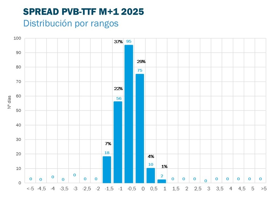 Gráfico 3. Distribución por rangos del spread PVB – TTF del producto M+1 en MIBGAS en 2025.